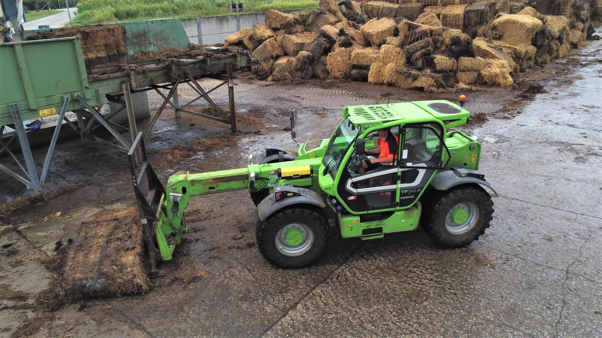 Le balle fermentano in modo naturale per un tempo stabilito. Terminato il quale il Merlo TF50.8 si occupa di prelevarle per alimentare la macchina trituratrice. Sia nell’accatastamento che nella successiva ripresa sono fondamentali sia la capacità di carico, sia l’altezza massima raggiungibile. Il sollevatore della Merlo ha infatti una caratteristica fondamentale che lo distingue dai diretti concorrenti della stessa classe: ha un diagramma di carico che prevede la massima portata alla massima altezza. Questo gli permette di operare in massima sicurezza in qualsiasi contesto operativo.